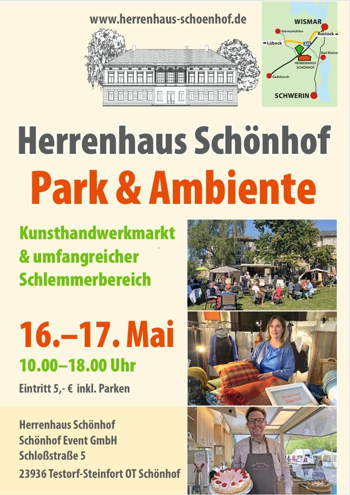Wir laden Sie herzlich ein, als Aussteller am neuen Kunsthandwerkermarkt im Herrenhaus Schönhof teilzunehmen, das sich idyllisch zwischen Schwerin und Wismar befindet. Mit viel Schwung starten wir am neuen, frischen Ort in die Marktsaison. Vor Ort laufen bereits die Dreharbeiten für die bundesweit bei VOX ausgestrahlte, und sehr erfolgreiche Sendung „Traumhaus oder Luftschloss?“. Ein weiterer bundesweiter, öffentlich-rechtlicher Sender plant auf dem Event dabei zu sein und darüber zu berichten.